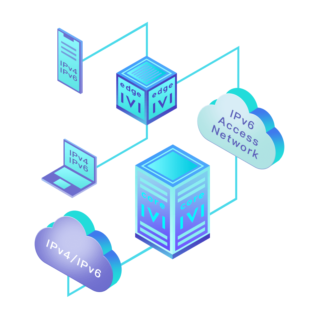 對(duì)正在進(jìn)行IPv6整體升級(jí)規(guī)劃的運(yùn)營(yíng)商,應(yīng)用IPv6升級(jí)方案2.5,通過(guò)IVI無(wú)狀態(tài)翻譯技術(shù)和純IPv6接入網(wǎng)絡(luò),為雙??蛻?hù)端和雙棧服務(wù)器提供連通服務(wù)。